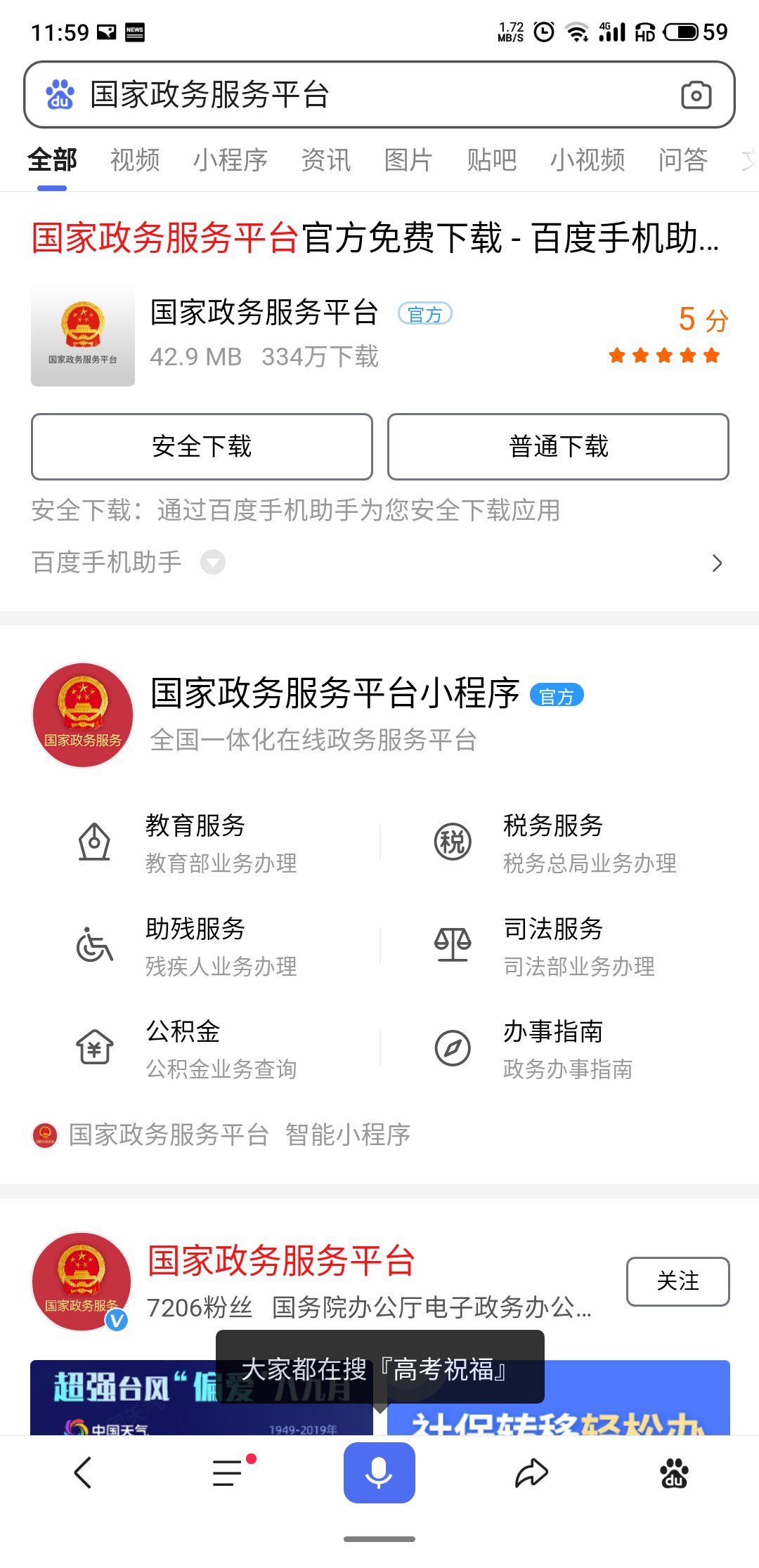 第一步:進(jìn)入百度,搜索國(guó)家政務(wù)服務(wù)平臺(tái)小程序,進(jìn)入小程序,找到教育服務(wù),點(diǎn)擊『更多』