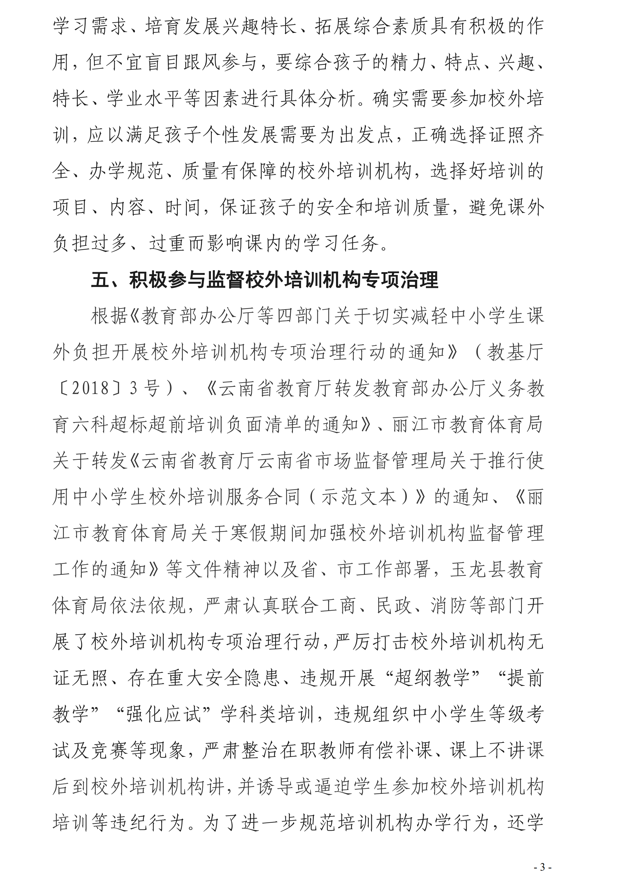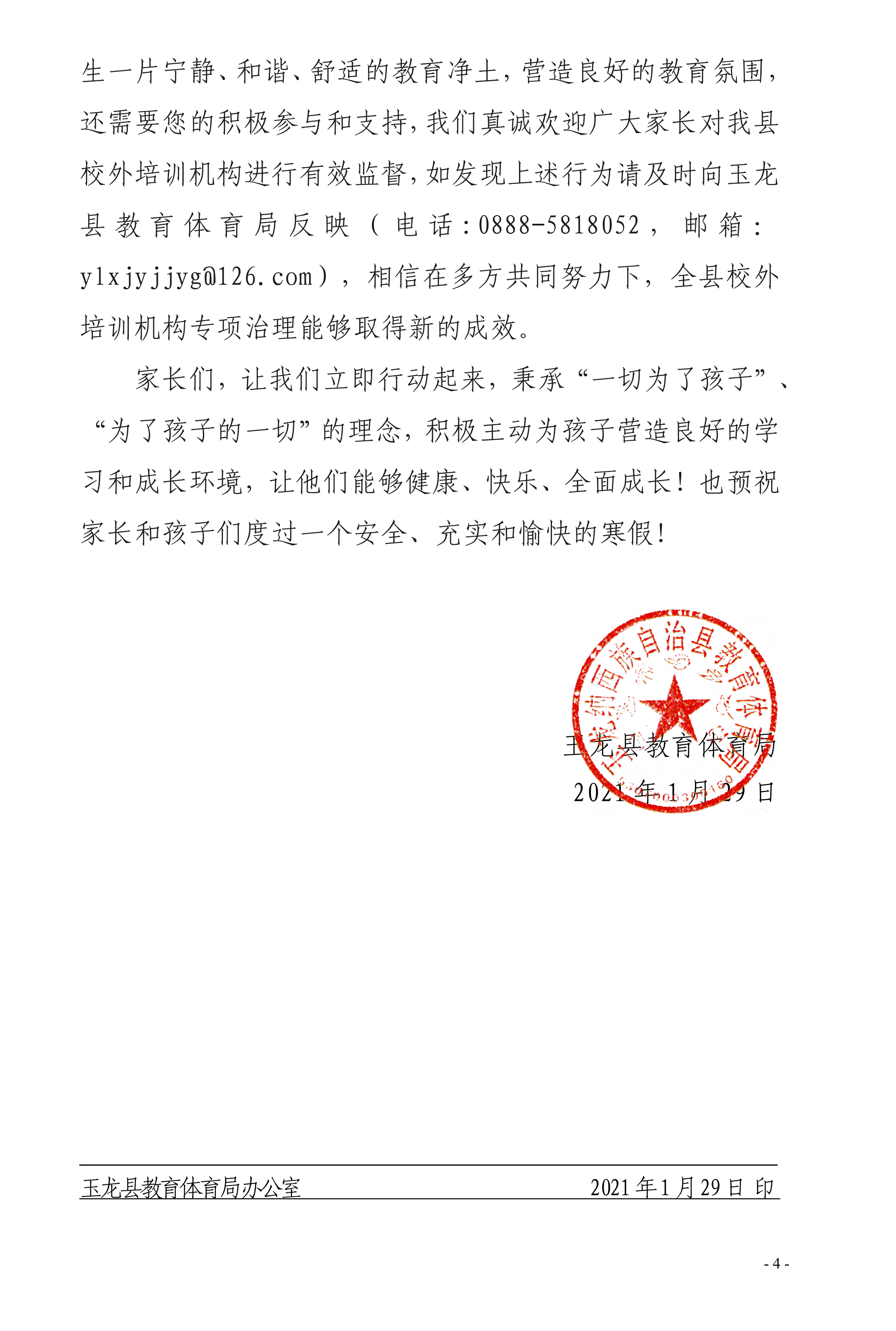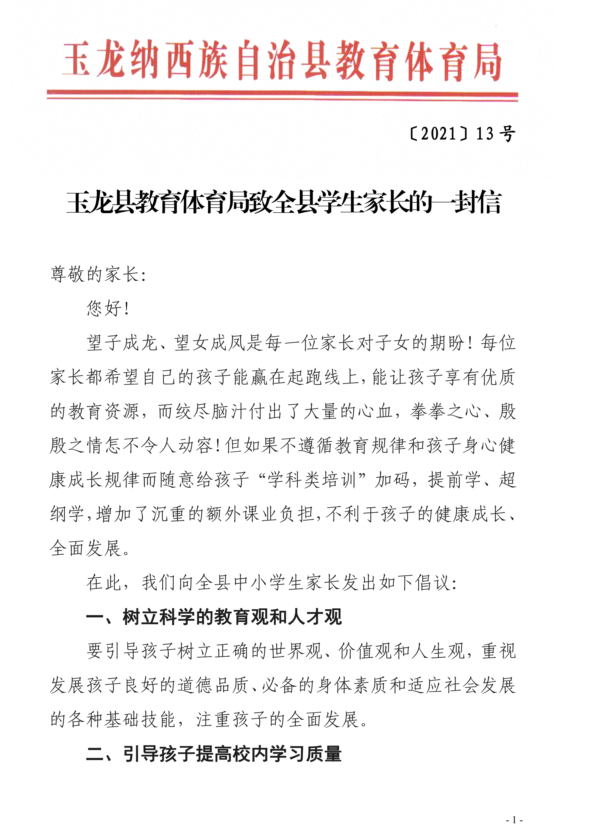 麗江市玉龍縣教育體育局致全縣學生家長的一封信