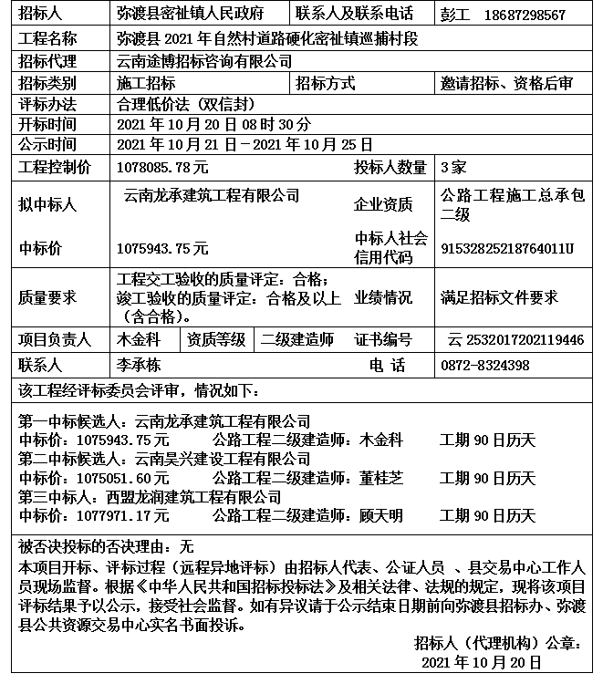 大理市彌渡縣2021年自然村道路硬化密祉鎮(zhèn)巡捕村段中標(biāo)候選人公示