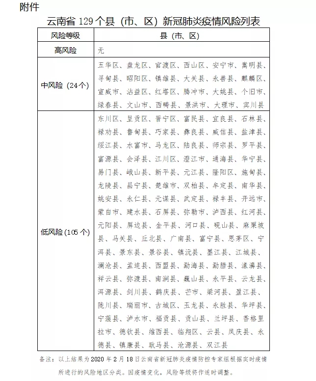 附件:云南省129個(gè)縣(市、區(qū))新冠肺炎疫情風(fēng)險(xiǎn)列表